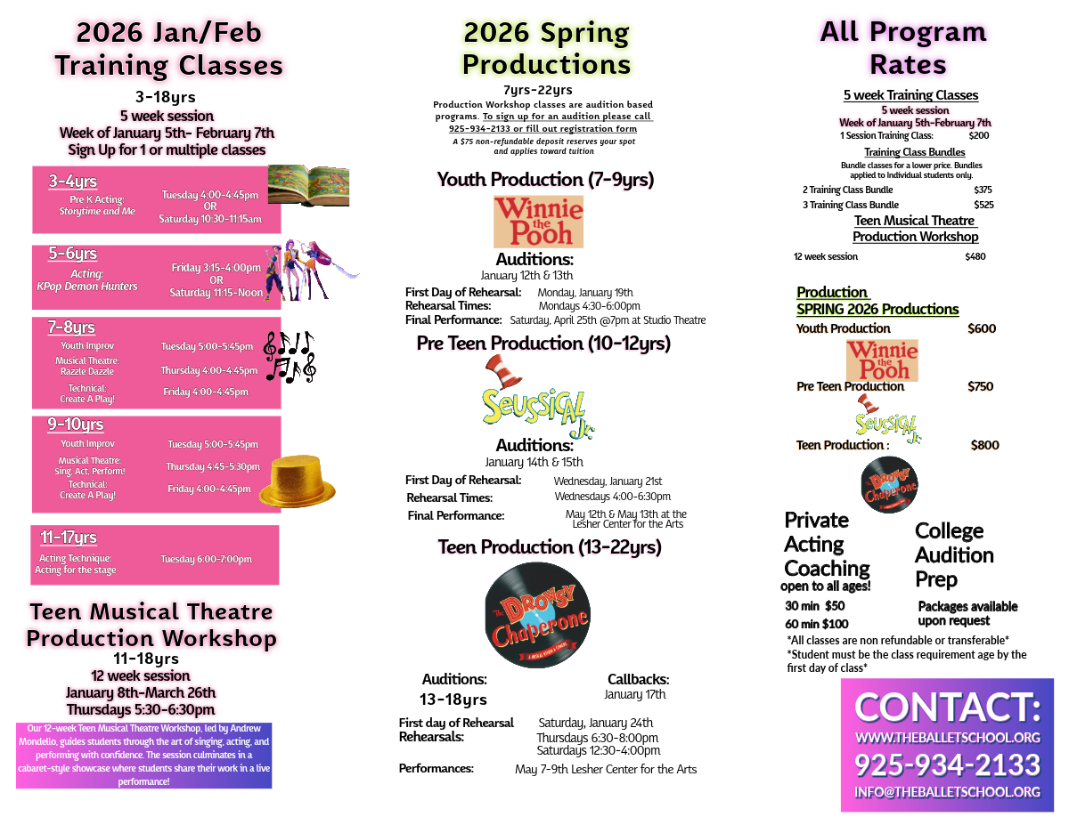 Performing Arts Studio is the award winning theatre program at The Ballet School Performing Arts. Offering classes beginning at pre-k all the way through adult. We offer session based training classes year round and Production Workshops where students audition and are cast in a full length play or musical.